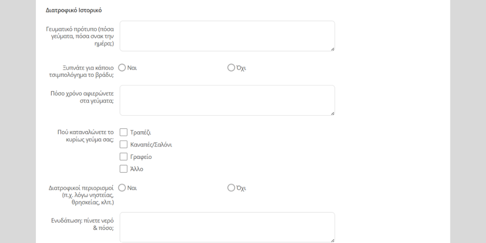 Για να είναι ένα πλάνο εφαρμόσιμο, πρέπει να ταιριάζει στη ζωή του διαιτώμενου. Το νέο ιστορικό εμβαθύνει στις συνήθειες του ατόμου με εξειδικευμένες ενότητες: